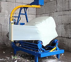 Pojízdný ovíjecí stůl zajíždí pod lisovací komoru a přímo, rychle a šetrně přebírá balík.